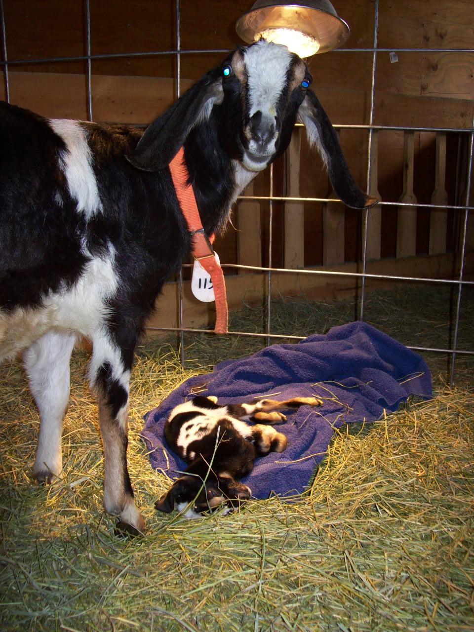 She was put by mistake with the bucks…she is very young and small and she was teerified when i found her in the middle of the night with her kids laying on the ground. She had no clue waht to do with them. It is kind of like having a 13 years old give birth to triplets….Anyway, 2 out 3 died and the third one is not looking good. She is getting better at motherhood and gets closer to her kid than ever.