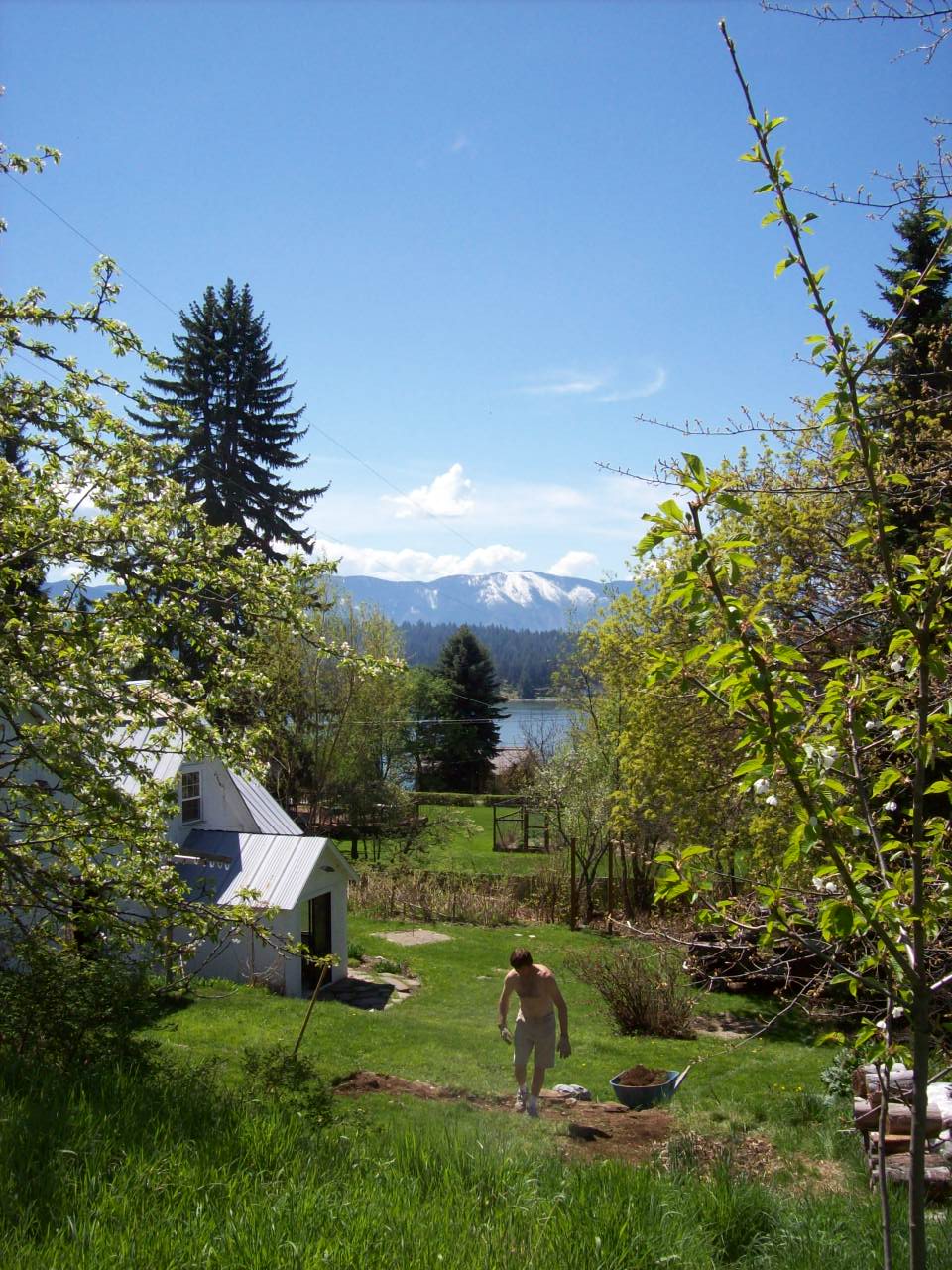 Derek is working on the first terrasse. I am in the upper part of the yard, looking down towards the lake.