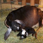 After pulling a 24-hour shift and having a couple hours of sleep, I am hoping that my cup of coffee is going to do miracles for me today: I was on milking duties in the morning and evening, and I was on night patrol too. When we made the schedule last week, I thought it was a great idea to have a couple days of morning and night shift on the same days, as usually, night is pretty mellow….well, until last night that is! One of the goat has been on the watch list for a few days but it was pretty sure she was going to have it yesterday. When i went to check at 2 a.m. I noticed she was having contractions so I assumed that it shouldn’t be too long; i should have remembered what assuming does! Over an hour and a half, later, the kid finaly came out on its own (i was afraid that i would have to help, because usually it does not take that long for the goat to push the baby out). What a relief. By that time, I was very cold, my fingers were numb and I sat waiting with the goat, in the pen, under the heat lamp, for what seems like an eternity. It took a while to hook the kid up to the mom but i keep remimding myself that boys are slower than girls, that’s how it goes…I knew one kid was still inside so i was hoping to get it over with quickly. Finally, an hour later, at 4:30 am, I see two back legs (this is not the way it is supposed) so I gear up and try to go inside the goat to see what’s happening. Now, the goat does not like that and she keeps moving around, which makes it very difficult to do anything, so I finally attached her because I did not want to go get someone just to hold the goat still. The breech position (back legs and butt first) is not great but it usually comes out okay as long as both legs are out at the same time. All i had to do was to pull on the legs and here it went! This little guy pushed my buttons though, and it probably was because i was exhausted by that time but he would not eat: he would not drink from the bottle, or from the teat (he would not swallow anything!). My first reaction was just to let go and be as stuborn as he was ( you will eat when you’re hungry type of reaction!) but it is very important that the kids get the colostrum asap so i spend quiet some time trying to get him to eat a tiny bit. Stuborn goat! Let me tell you that goats are teaching me patience, everyday, but they also make me laugh everyday so i guess it is a good balance!