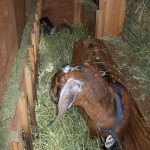 Another difficult birth occured few days ago and the mom is slowly recover from it. Kala was in labor for over 24 hours but nothing was happening. Ed asked me to go inside and check what was happening: well, nothing was happening and she was not even dilated! So I put a couple capsules of evening primrose oil in her vagina (it is supposed to help with dilatation) and we waited for some time. In the mid afternoon, I went inside to check again and she was still not dilated. She looked uncomfortable (laying down/standing/ making noises,etc) but not in too much pain so we decided to wait and let Mother Nature do her work. The next day, nothing was happening so Maureen, another worker, went inside to check ( i was supposed to have a day off) and Kala was still not dilated; so they gave her more evening primrose oil. She finaly started to dilate but what happened is that she has been pushing for hours, before the kids had a chance to come out, so once there was an opening they all tried to come out at the same time…and there is only room for one at a time. So Maureen spend a couple hours trying to get the kids out, unsuccessfully, and then I spent about an hour and half working on her as well. It was very dramatic: kala was suffering and she was so exhausted. I felt helpless but i kept my calm and did not get too stressed out: i knew it was in Kala’s best interest to remain calm (and for my own sake too!). It was very hard to figure out what legs belong to what body and there were so many legs! It took me a while to figure out this whole mess and once i did, I started pulling on the head and one leg and the baby finally came out, dead. Then i got the other one out, dead also. The poor mama spend over 24 hours in misery and her babies are dead. She is still recovering, and I am still recovering. It was probably the hardest delivery I had to do so far. I am not sure why she wasn’t dilating; Ed does not know either. It amazes me how often we have to intervene with birthing (I thought it would happen naturally more often).